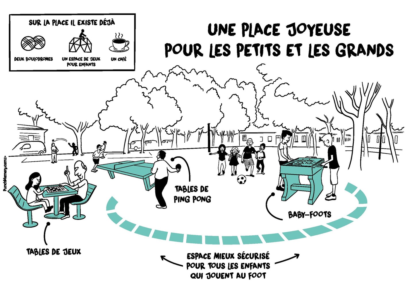 Le projet vise à réaménager la place Ferdinand Buisson pour en faire un espace de vie convivial et sécurisé. Des installations comme une table de ping-pong, une marelle, et des tables de jeux (dames/échecs) seront ajoutées, ainsi qu'un possible espace de football. La sécurité des enfants est prioritaire : pour limiter les traversées dangereuses, notamment des deux-roues, la traversée diagonale entre les rues Beck et Son Tay sera restreinte. Dans ce quartier où peu de familles possèdent un jardin, cet aménagement offrira un espace extérieur agréable et ombragé, adapté à toutes les générations, particulièrement pendant les fortes chaleurs estivales.