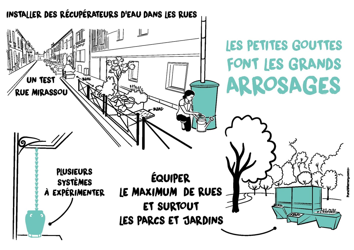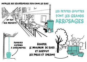 Installer des récupérateurs d’eau dans les parcs, jardins partagés et rues végétalisées de Bordeaux, comme le parc de la Faïencerie ou le Jardin public, permettrait d'optimiser l'arrosage et le nettoyage de la voirie en préservant les ressources et en évitant de rejeter de l’eau de pluie dans le réseau d’eau pluvial. Intégrés dans le paysage, par exemple sous la forme de bancs réservoirs, ces dispositifs pourraient se fondre harmonieusement dans l'environnement grâce à une végétalisation autour des installations. Ce projet, en phase avec les initiatives de végétalisation de la ville, pourrait être lancé à titre expérimental dans des zones déjà végétalisées, comme la rue Roger Mirassou, et étendu aux futurs parcs en construction.