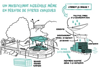 Le projet propose d’installer une structure de rafraîchissement naturel entre le jardin de la Béchade et le cours Maréchal Gallieni, une zone manquant d’espaces publics de qualité. La place Valmy pourrait accueillir cette structure innovante, utilisant l’inertie des briques de terre cuite, la récupération d’eau de pluie et le transfert de calories pour rafraîchir l’air. Ce lieu, fonctionnel l’été et tout au long de l’année, offrirait un espace de rencontre, particulièrement à la sortie des crèches et écoles. L’objectif est de lutter contre les îlots de chaleur tout en revitalisant un espace public sous-exploité.